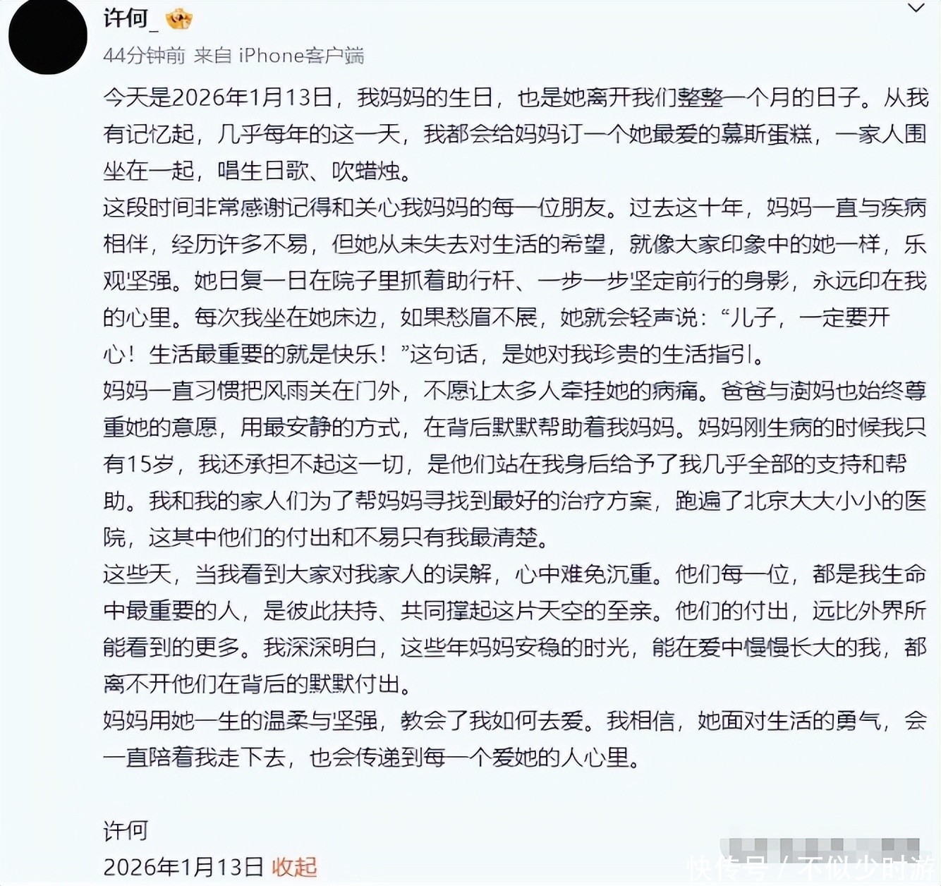 何晴离世一个月,儿子许何发长文悼念并为家人发声:妈妈的勇气会一直陪我走下去---2026-01-13----现代快报