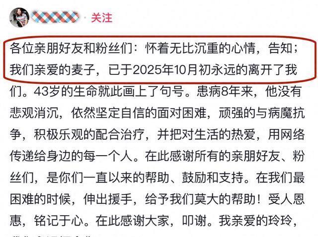 而这也变成了她最后一个生日,在12月22号很久没更新的账号,突然发布了一条讣告。 从讣告中得知她早在两个月前就已经去世了,终年四十三岁。