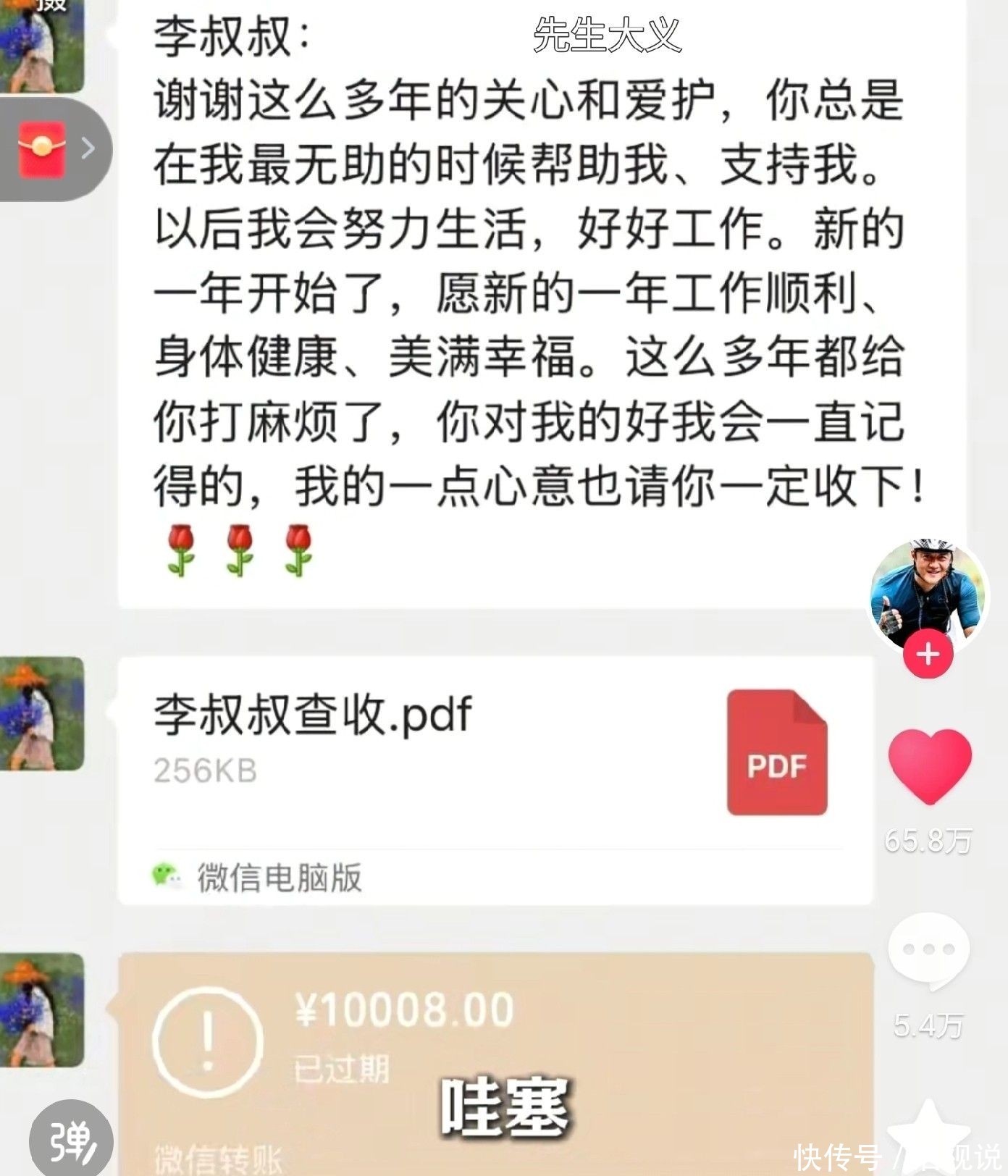 14. 最令李亚鹏心头一震的是,当春燕开始工作、有了收入后,她特意写了一封真挚的感谢信,并转账一笔金额:10008元。