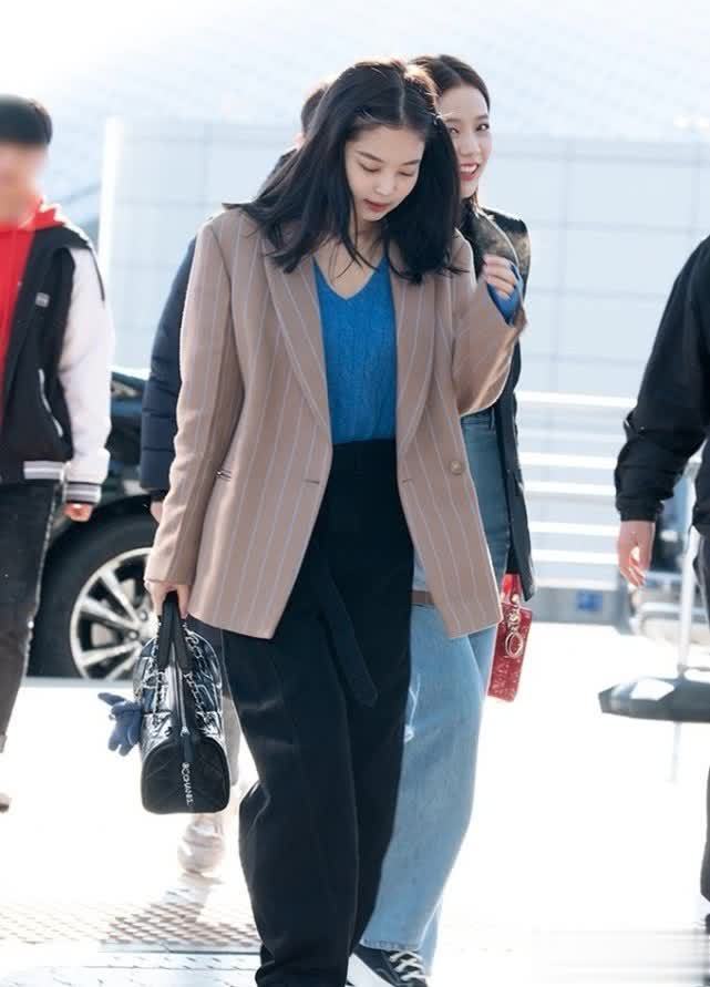 金智妮的其他造型也好看,像这身服装就很优雅大方,很显气质。一件蓝色的针织衫+条纹的西装,宽松的搭配,很适合春秋季节穿。而黑色阔腿裤更是百搭不挑人,不管是搭配西装还是牛仔外套,都很时尚个性。
